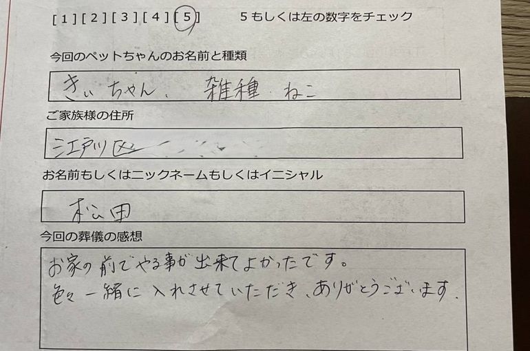 松田様、この度はきぃちゃんの大切な旅立ちをお任せいただき、本当にありがとうございました。