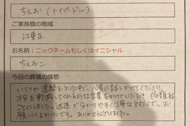 「いくつか連絡をとる中で、毎回、同じ方が対応してくださり、不安を軽減してくれるような言葉をかけていただき、信頼することができました。当日も、ていねいでやさしいご対応で、お願いしてよかったです。ありがとうございました。」